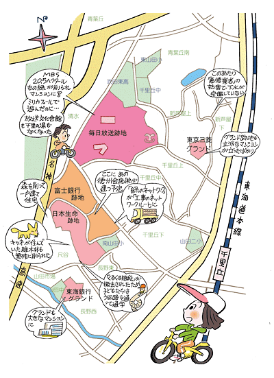 「うわっ、この山、ほとんど全部削られて、何か建つようですよ」「ここが日生団地の森や。全部で約10ヘクタールの広大な社宅含めた山林が、マンションと戸建住宅に開発されてしまうんや」「この日生団地の森にはキツネが住んでいたそうですね。キツネはどこかに逃げていったのかな?」「この道、『緑のネットワークルート』と銘打ってますが、両サイドは工事現場になりましたよ。これでは『工事のネットワークルート』やないですか」。