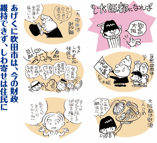 その橋下知事、彼は一体なにを目指そうとしているのか。880万人の大阪府民をどこへ運ぼうとしているのだろうか。大阪都構想を掲げる橋下知事は、大阪という都市を統一するため、大阪府や大阪市を本気で潰そうとしている。いや、大阪市だけではない。この吹田市だってマナ板に乗っている。知事派が選挙で勝利すれば、わが街・吹田市も無傷ではいられないのだ。