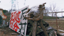 餓死した牛の頭蓋骨と東電への抗議看板が並ぶY牧場